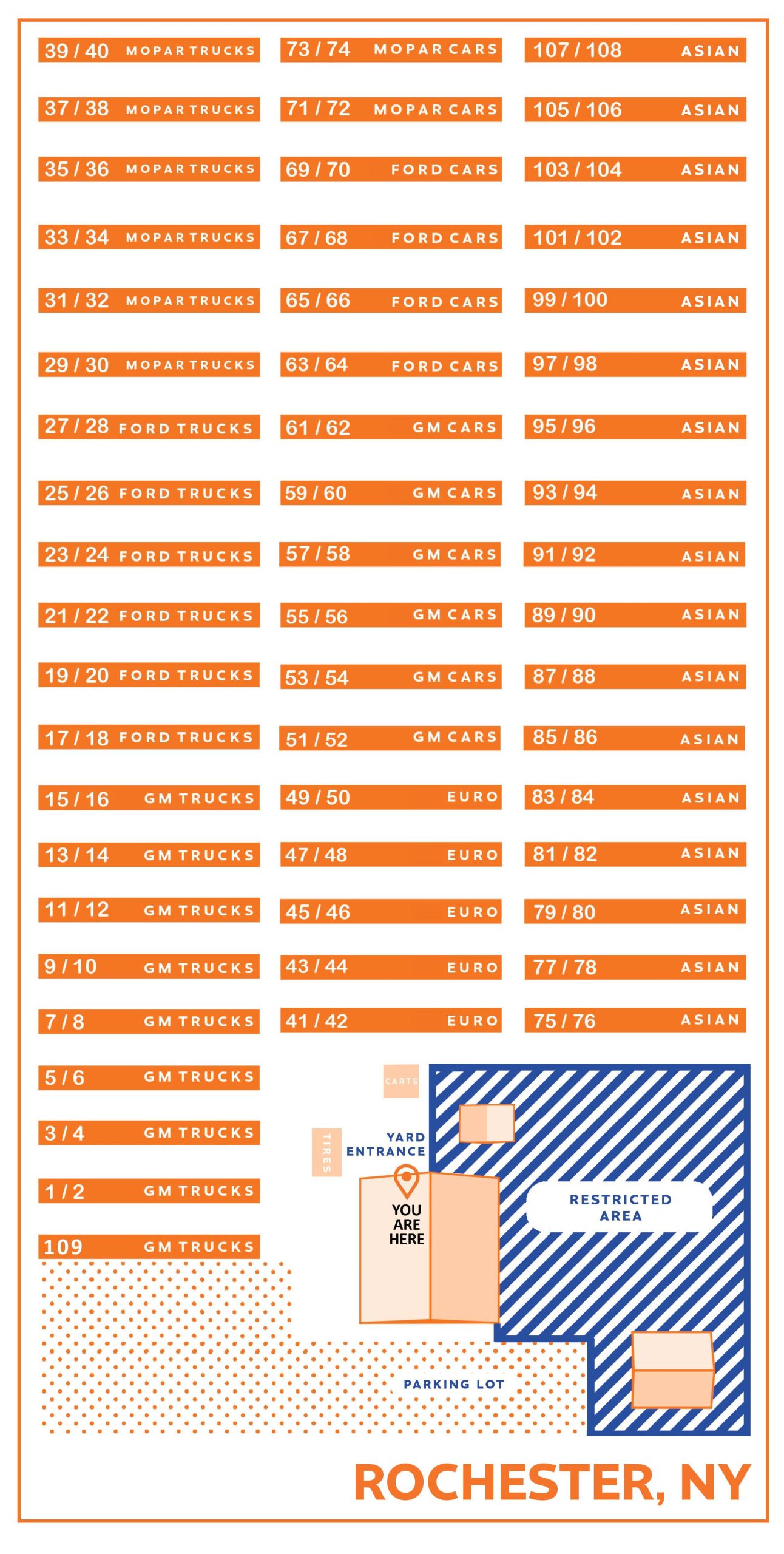 - Parts are NOT allowed in the yard. You will be charged for all parts brought to the checkout counter.